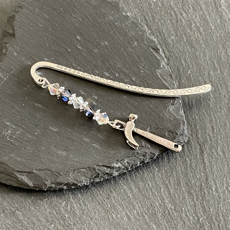 A sparkly Preciosa Crystals and Tibetan Hammer Charm bookmark in Crystal Heliotrope AB and Clear AB. Supplied in a white organza gift bag.