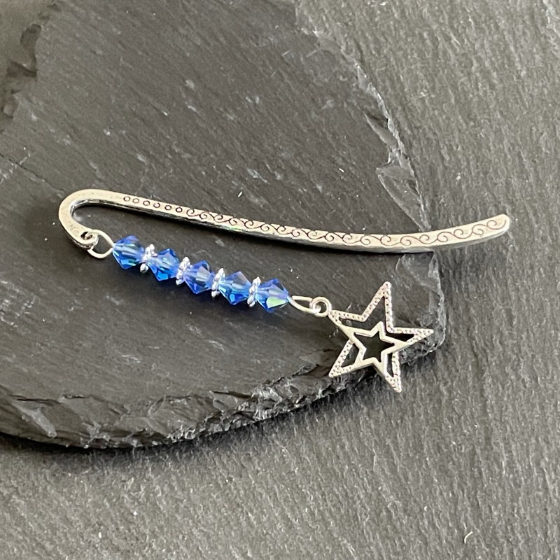 A sparkly Preciosa Crystals and Tibetan Stars Charm bookmark in Sapphire AB blue. Supplied in a white organza gift bag.