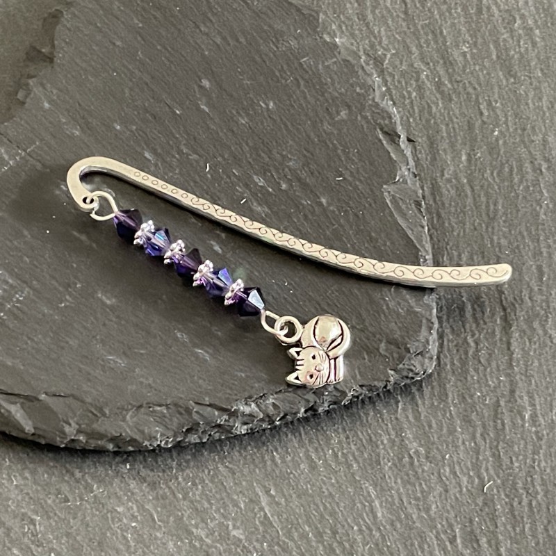 A sparkly Preciosa Crystals and Tibetan Cat Charm bookmark in Deep Tanzanite AB and Tanzanite AB purple. Supplied in a white organza gift bag.
