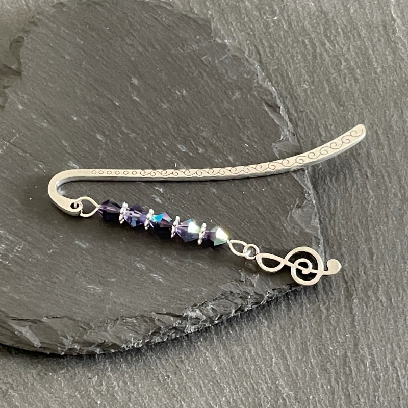 A sparkly Preciosa Crystals and Tibetan Treble Clef Charm bookmark in Deep Tanzanite AB purple Supplied in a white organza gift bag.