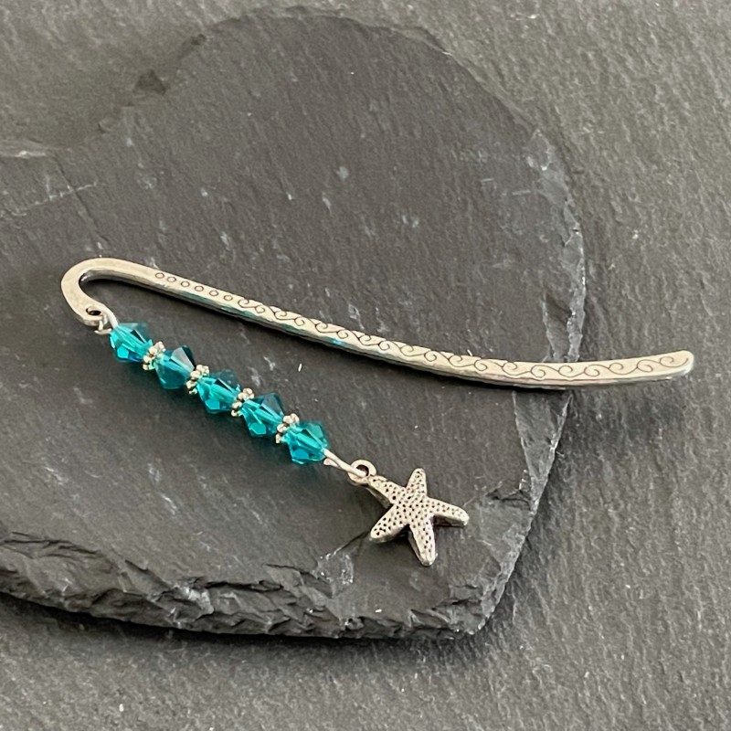 A sparkly Preciosa Crystals and Tibetan Starfish Charm bookmark in Blue Zircon AB turquoise. Supplied in a white organza gift bag.