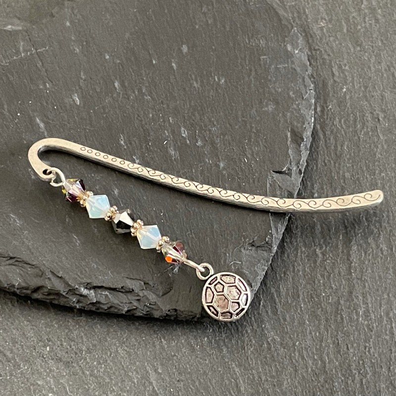 A sparkly Preciosa Crystals and Tibetan Football Charm bookmark in Crystal Heliotrope AB grey and White Alabaster AB white. Supplied in a white organza gift bag.