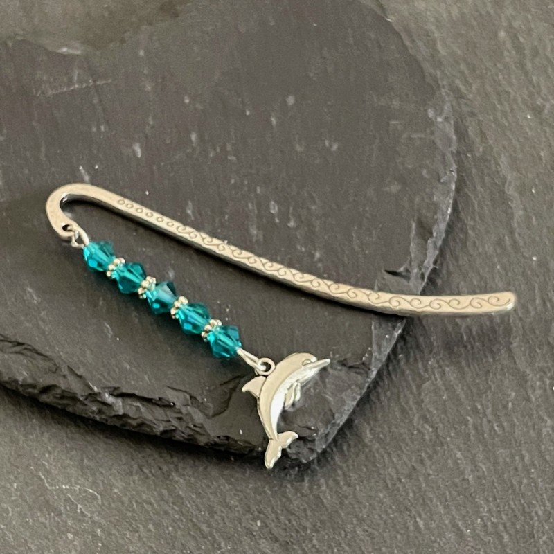 A sparkly Preciosa Crystals and Tibetan Dolphin Charm bookmark in Blue Zircon AB turquoise. Supplied in a white organza gift bag.