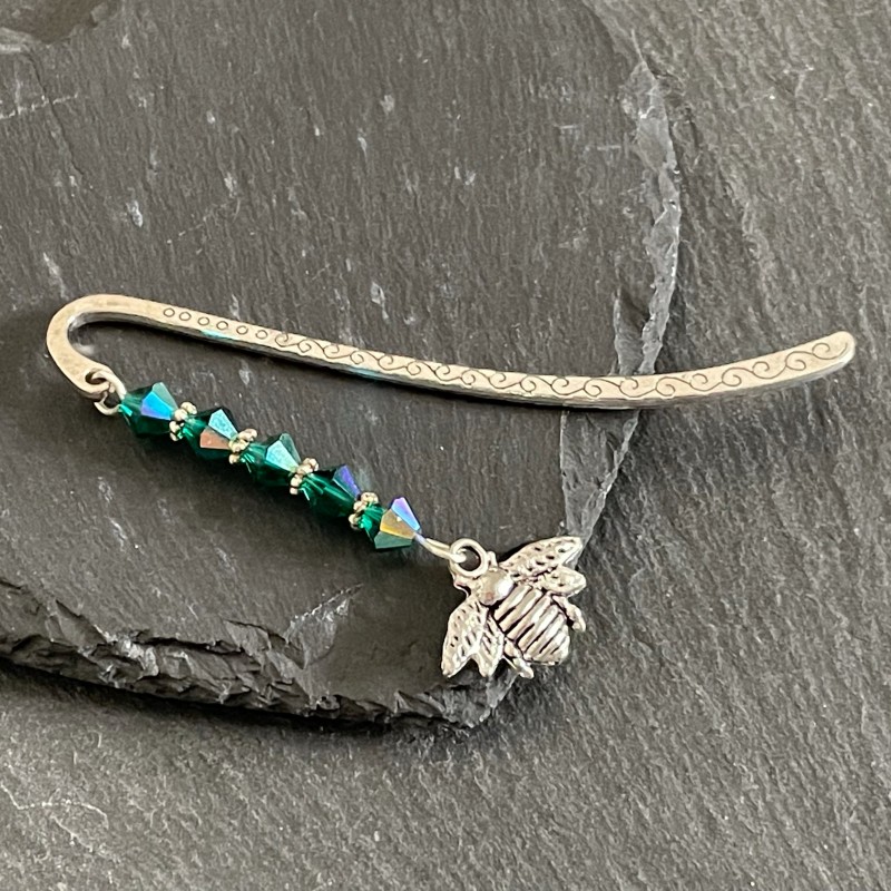 A sparkly Preciosa Crystals and Tibetan Bee Charm bookmark in Emerald AB green. Supplied in a white organza gift bag.