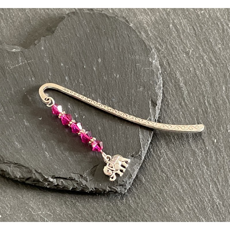 A sparkly Preciosa Crystals and Tibetan Elephant Charm bookmark in Fuschia AB pink. Supplied in a white organza gift bag.