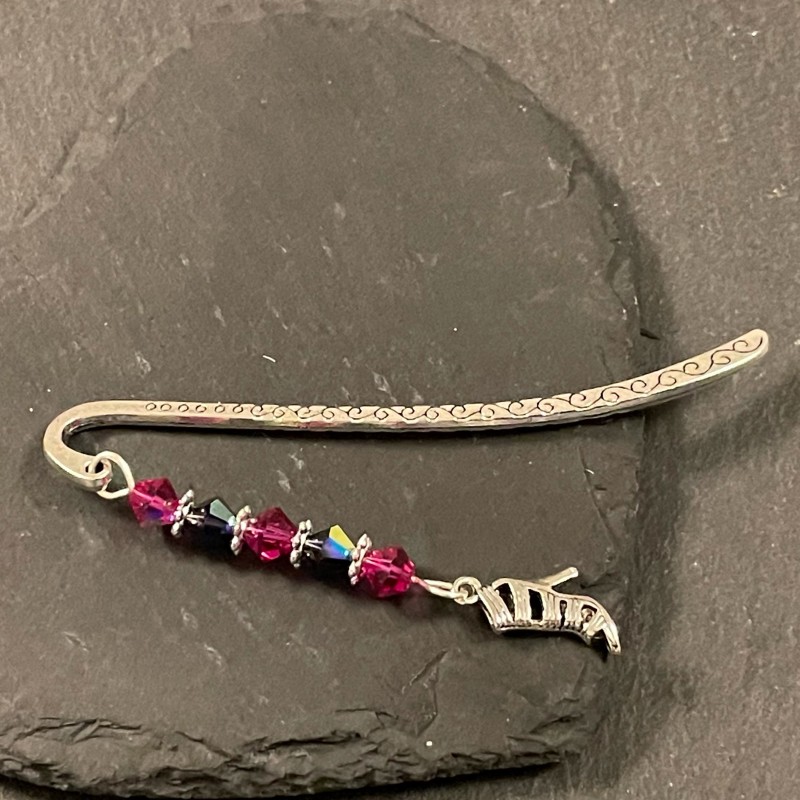 A sparkly Preciosa Crystals and Tibetan Sandal Charm bookmark in Fucshia AB pink and Deep Tanzanite AB purple. Supplied in a white organza gift bag.