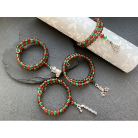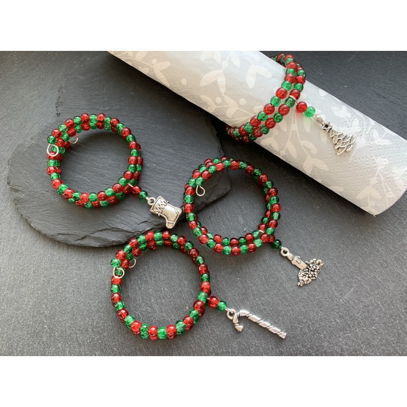Napkin Rings (for paper napkins) using coloured glass beads and a Tibetan Christmas charm. Supplied in a white organza gift bag.
