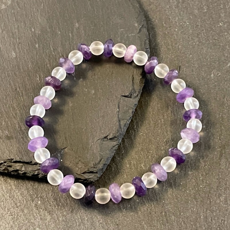 Frosted Amethyst and clear Quartz stretchy bracelet, fits wrist size 7". Supplied in a white organza bag.