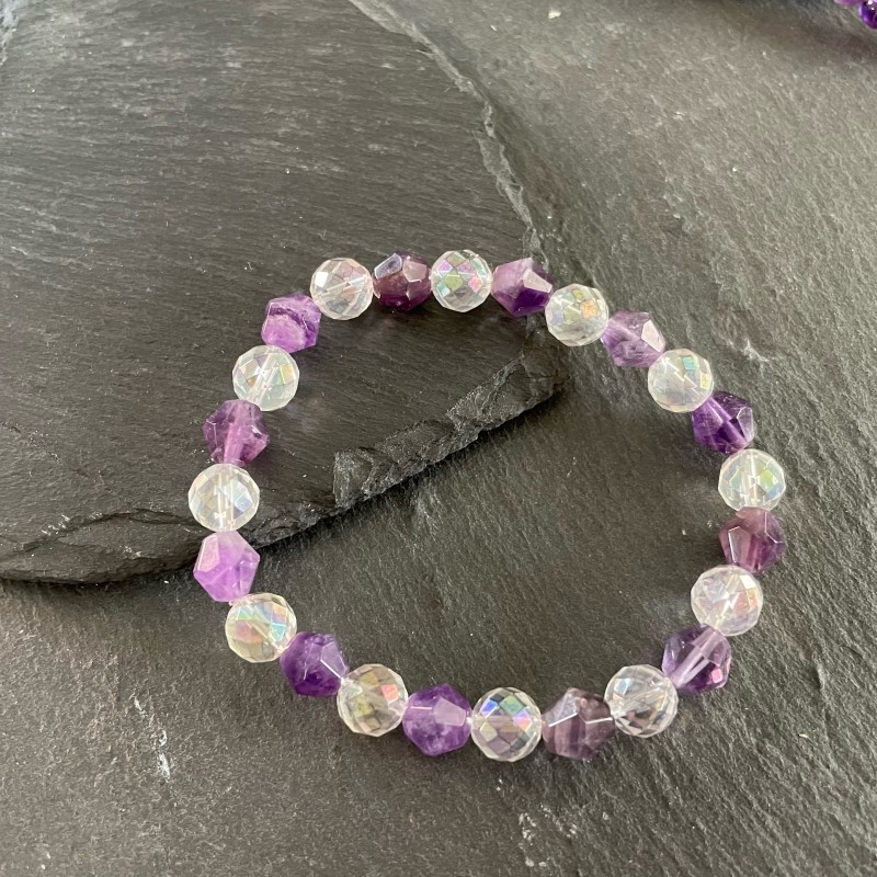 Amethyst and clear Quartz stretchy bracelet, fits wrist size 6 1/2". Bead size approx 8mm. Supplied in a white organza bag.