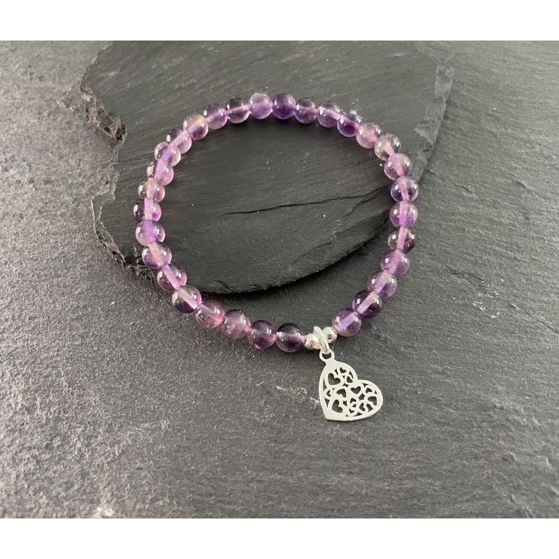 Amethyst and Sterling Silver Multi Heart Charm stretchy bracelet, bead size approx 6mm. Fits wrist size 7 1/4". Supplied in a white organza bag.