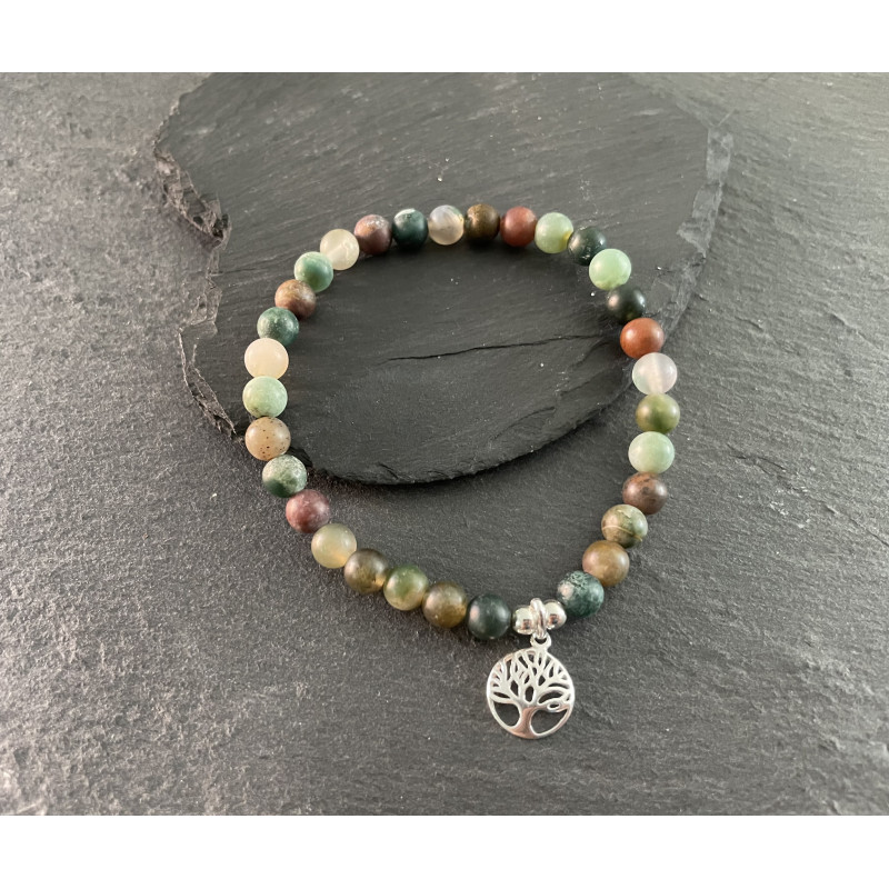Indian Agate Frosted and Sterling Silver Domed Tree Charm stretchy bracelet, bead size approx 6mm. Fits wrist size 6 3/4". Supplied in a white organza bag.