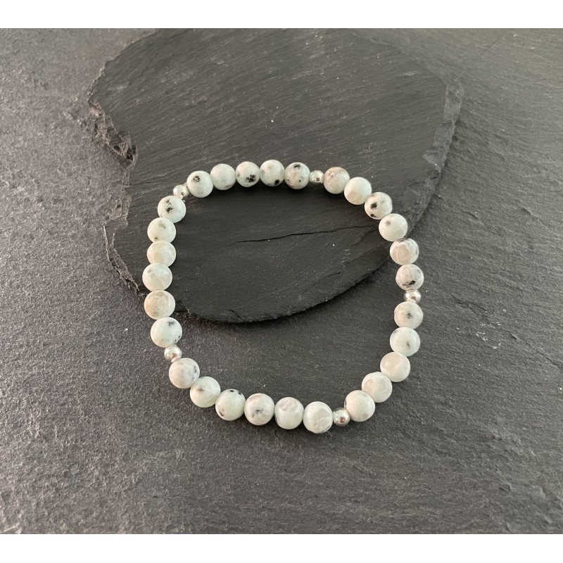 Kiwi Jasper Frosted stretchy bracelet, bead size approx 6mm. Fits wrist size 7". Supplied in a white organza bag.