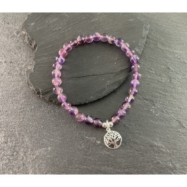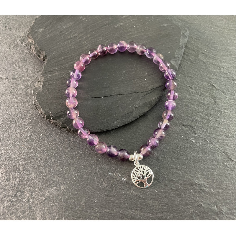 Amethyst and Sterling Silver Domed Tree Charm stretchy bracelet, bead size approx 6mm. Fits wrist size 7 1/4". Supplied in a white organza bag.