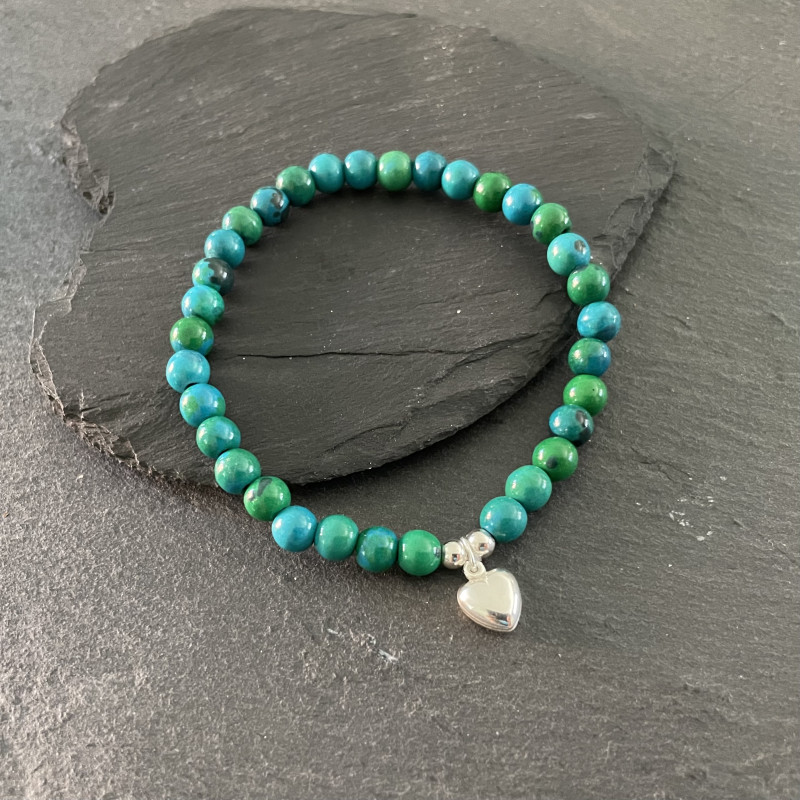 Chryscolla and Azurite and Sterling Silver Puffy Heart Charm stretchy bracelet, bead size approx 8mm. Fits wrist size 7". Supplied in a white organza bag.
