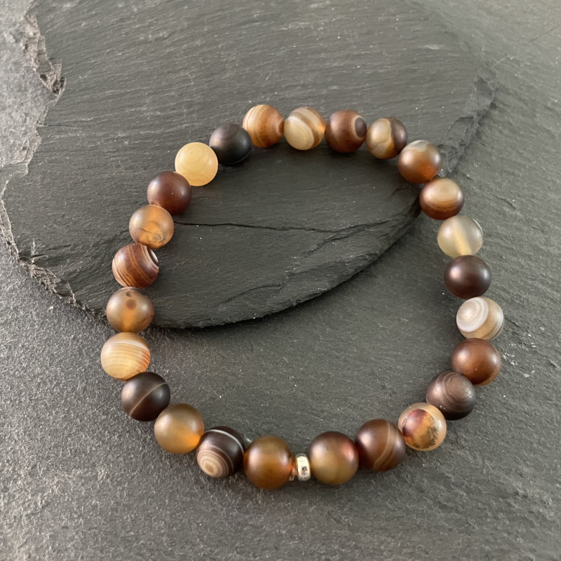 Brown Banded Frosted Agate stretchy bracelet, bead size approx 8mm. Fits wrist size 7". Supplied in a white organza bag.