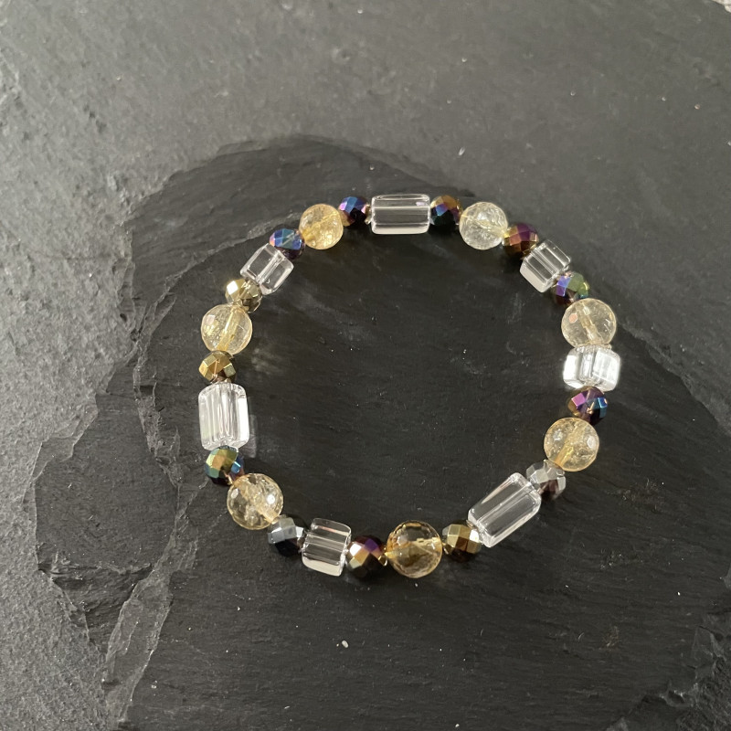 Citrine, Clear and Smoky Quartz stretchy bracelet, bead size approx 8mm. Fits wrist size 6 3/4". Supplied in a white organza bag.