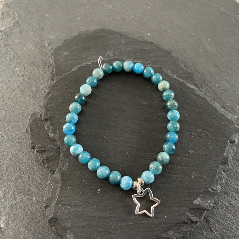 Apatite and Sterling Silver Outline Star Charm stretchy bracelet, bead size approx 6mm. Fits wrist size 6 3/4". Supplied in a white organza bag.