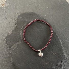 Garnet and Sterling Silver Puffy Heart Charm stretchy bracelet, bead size approx 4mm. Fits wrist size 7". Supplied in a white organza bag.