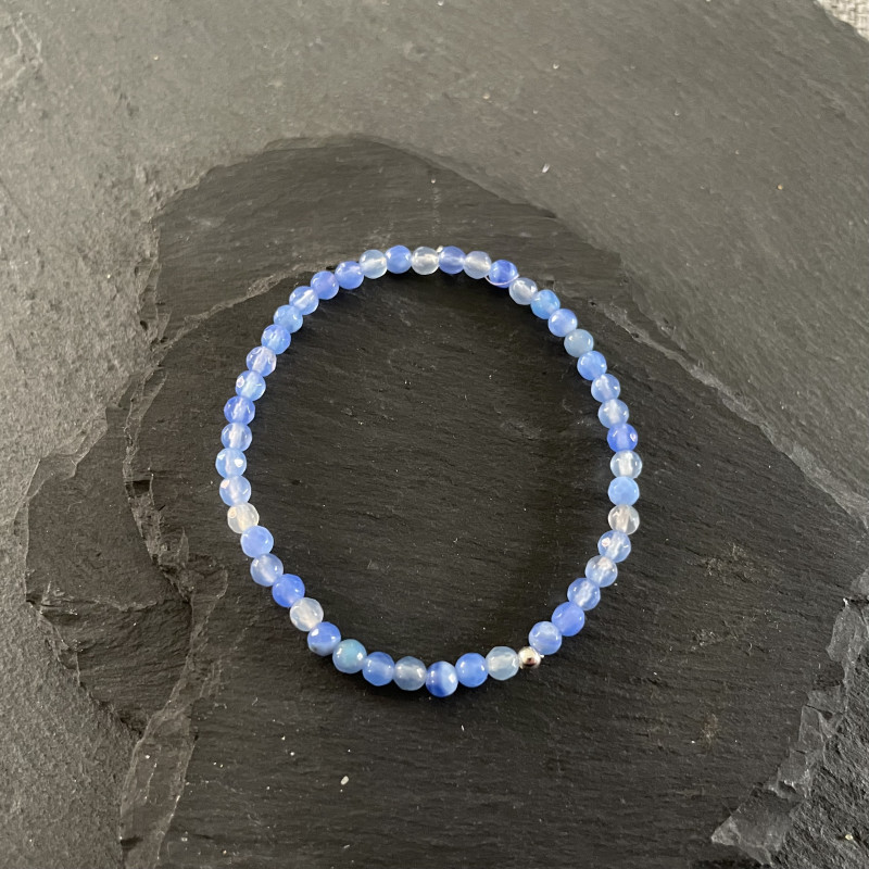 Faceted Blue Quartz stretchy bracelet, bead size approx 4mm. Fits wrist size 6 3/4". Supplied in a white organza bag.