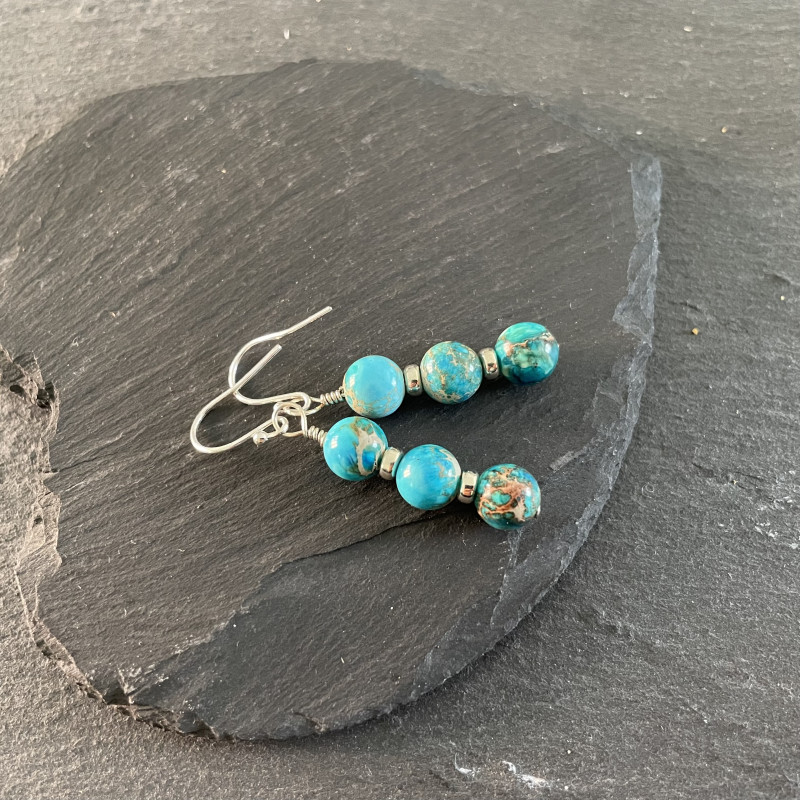 Sterling silver and blue Jasper earrings. Bead size approx 8mm. Approx drop length (including earwires) 4.8cms. Supplied in a white organza bag.