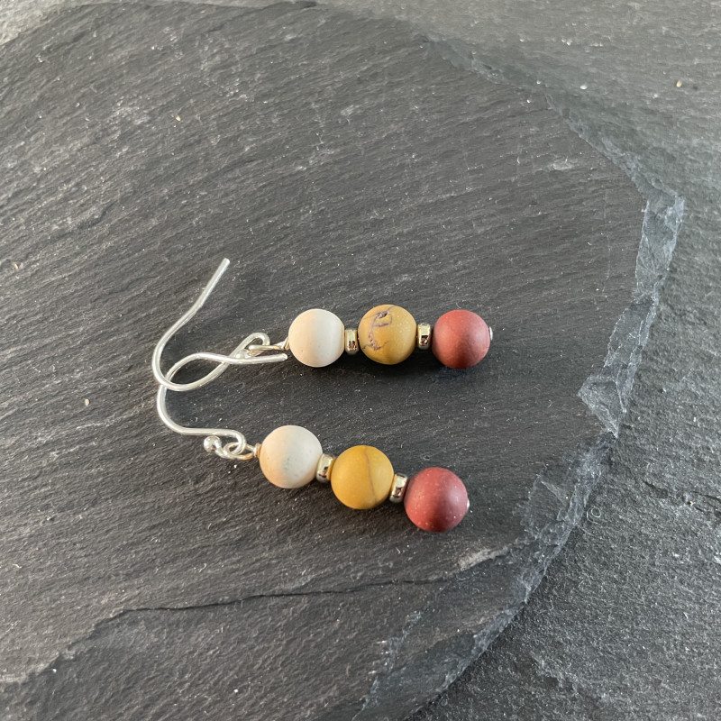 Sterling silver and frosted Mookite earrings. Bead size approx 6mm. Approx drop length (including earwires) 4.2cms. Supplied in a white organza bag.