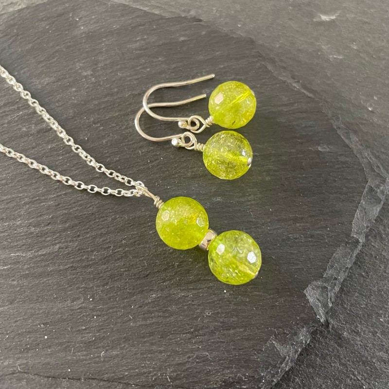 Sterling silver and facetted Peridot necklace with Sterling Silver 18" belcher chain and earrings. Necklace approx drop length 3cms and earrings (including earwires) 2.8cms. Supplied in a white organza bag.