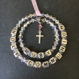 Please email name (upto 11 characters on smaller ring) and whether Holy Communion or Christening (on larger ring) and what colour crystal/ribbon required (light or dark pink, light or dark blue or clear/white) to karen@aboojewellery.co.uk.