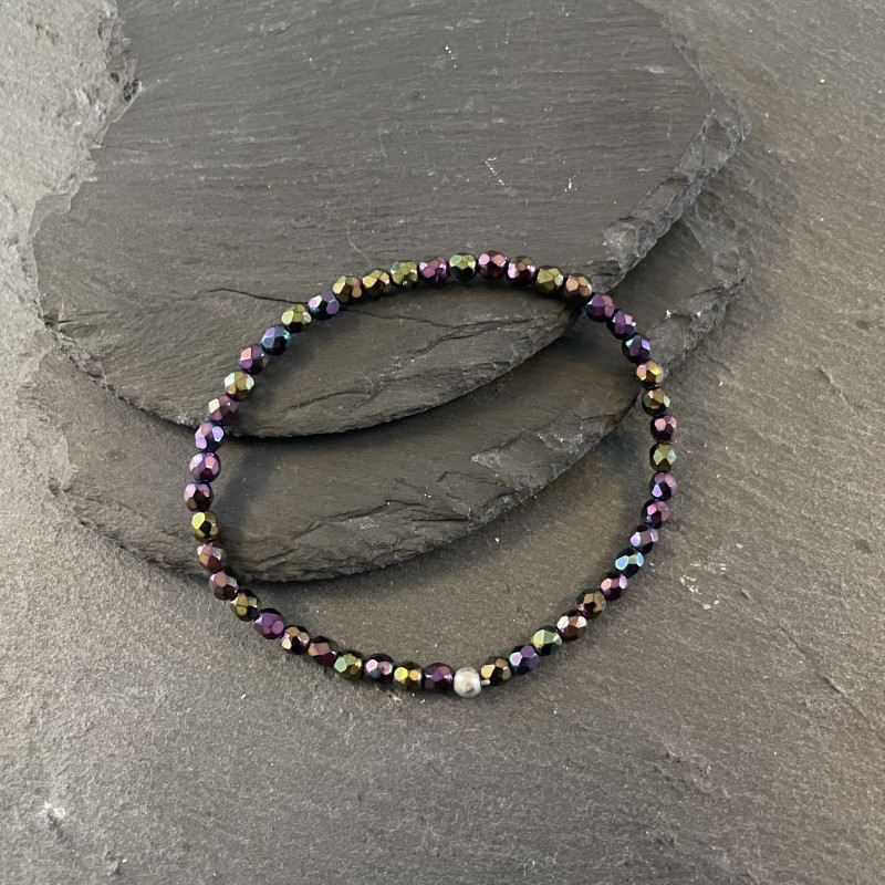 Preciosa Crystal stretchy bracelet - black midnight beads, approx size 4x3mm. Fits wrist size approx 7 1/4". Supplied in a white organza bag.