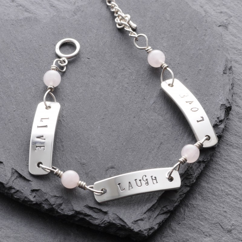 Handcrafted sterling silver handstamped "Live Laugh Love" toggle bracelet with rose quartz beads. Approx length (including toggle and bar clasp) 20.6cms. Fits wrist size 17 to 18.5cms. Fully Hallmarked by the London Assay Office. Packed in a jewellery box.