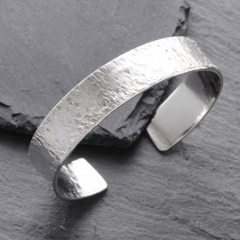 Handcrafted sterling silver textured cuff bangle. Fits wrist size 17 to 18.5cms, gap 2.3cms. Fully Hallmarked by the London Assay Office. Packed in a jewellery box.