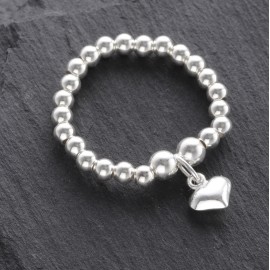 Sterling silver stretchy beaded ring with puffy heart charm, fits size P-Q. Ideal for stacking. Supplied in a white organza bag.