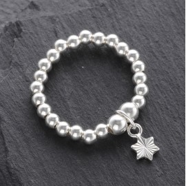 Sterling silver stretchy beaded ring with cut star charm, fits size P-Q. Ideal for stacking. Supplied in a white organza bag.