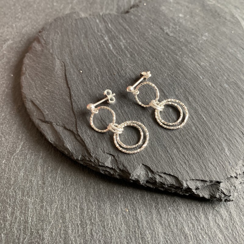 Sterling Silver pair of stud earrings - diamond cut rings . Drop length approx 2.7cms (including earposts). Supplied in a white organza gift bag.