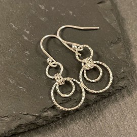 A Sterling Silver pair of earrings - Diamond Cut rings. Drop length approx 3.5cms (including earwires).
