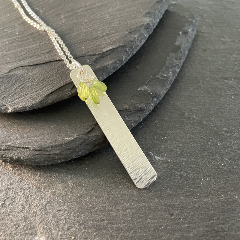 Handcrafted sterling silver textured rectangle with faceted Peridot on a 18" sterling silver belcher chain. The length 5.5cms (approx) including the jump ring. Fully Hallmarked by the London Assay Office. Packed in a jewellery box.