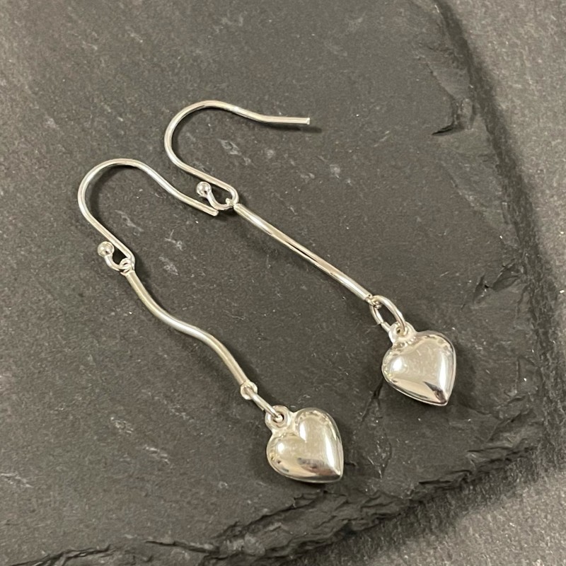 A Sterling Silver pair dangly earrings - puffy hearts. Drop length approx 5.2cms (including earwires). Supplied in a white organza gift bag.