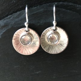 A stunning pair of handmade Sterling Silver and Swarovski Earrings using sparkly Crystallised Swarovski channel charms in Clear on sterling silver earwires with a textured domed disc. Drop length approx 2.8cms (including earwires). Clear is April birthstone colour. Supplied in a white organza gift bag.