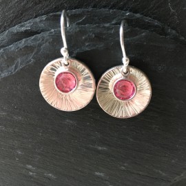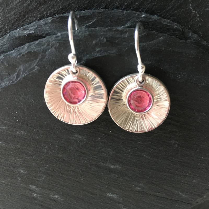 A stunning pair of handmade Sterling Silver and Swarovski Earrings using sparkly Crystallised Swarovski channel charms in Rose on sterling silver earwires with a textured domed disc. Drop length approx 2.8cms (including earwires). Rose is October birthstone colour. Supplied in a white organza gift bag.