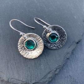 A stunning pair of handmade Sterling Silver and Swarovski Earrings using sparkly Crystallised Swarovski channel charms in Emerald on sterling silver earwires with a textured domed disc. Drop length approx 2.8cms (including earwires). Emerald is May birthstone colour. Supplied in a white organza gift bag.
