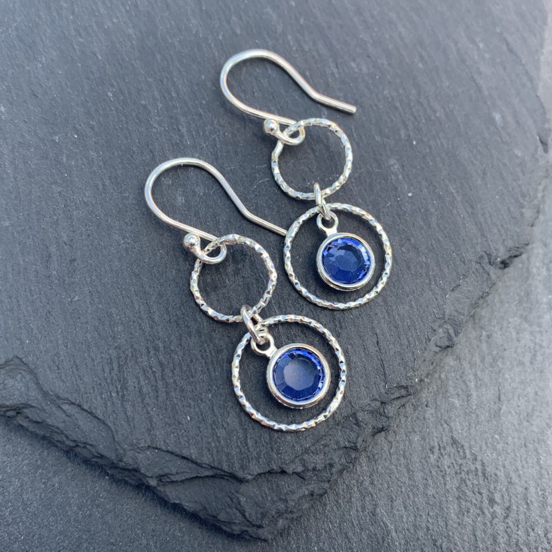 A stunning pair of handmade Sterling Silver and Swarovski Earrings using sparkly Crystallised Swarovski channel charms in Emerald on sterling silver earwires with a textured ring. Drop length approx 3cms (including earwires). Sapphire is September birthstone colour. Supplied in a white organza gift bag.