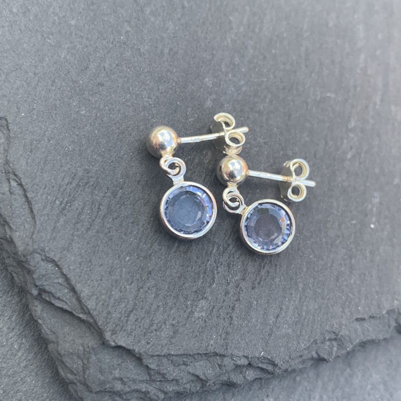 A stunning pair of handmade Sterling Silver and Swarovski Stud Earrings using sparkly Crystallised Swarovski channel charms in Light Sapphire. Drop length approx 1.4cms (including earwires). Light Sapphire is December birthstone colour. Supplied in a white organza gift bag.