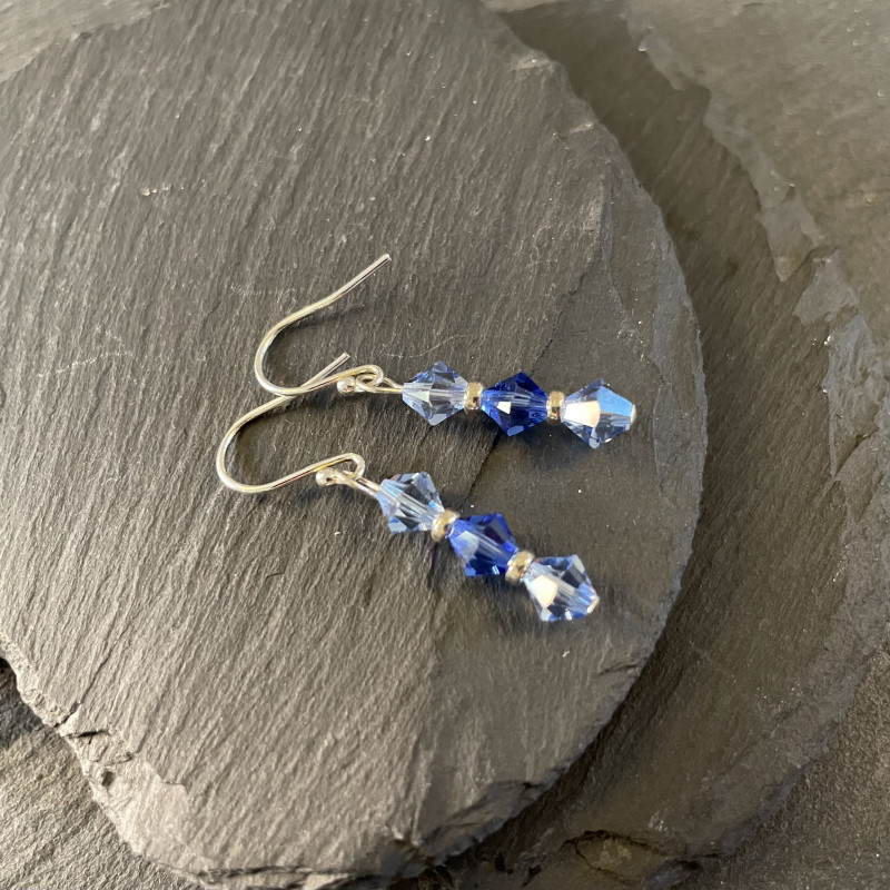 Sterling silver and Swarovski crystal earrings - blue. Approx drop length (including earwires) 4cms. Supplied in a white organza bag.