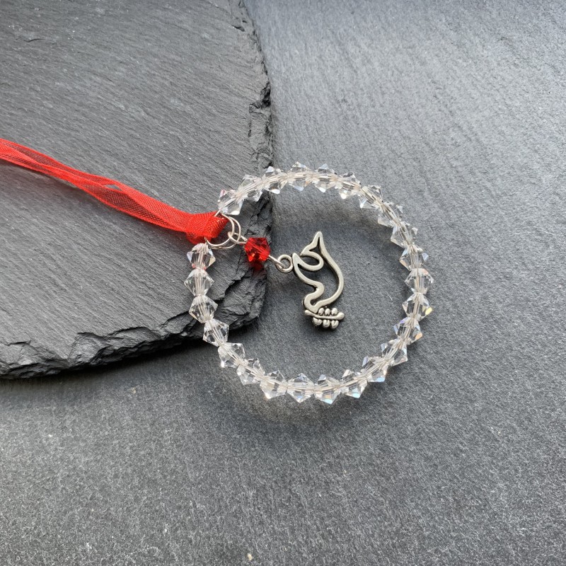 A stunning handmade Tibetan Dove Charm Christmas Decoration using sparkly Preciosa Crystal with red organza ribbon. Size 4.5cms (excluding ribbon). Supplied in a white organza gift bag.