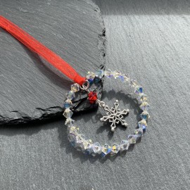 A stunning handmade Tibetan Snowflake3 Charm Christmas Decoration using sparkly Preciosa Crystal with red organza ribbon. Size 4.5cms (excluding ribbon). Supplied in a white organza gift bag.
