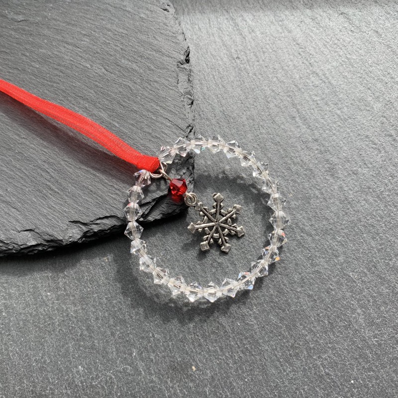 A stunning handmade Tibetan Snowflake4 Charm Christmas Decoration using sparkly Preciosa Crystal with red organza ribbon. Size 4.5cms (excluding ribbon). Supplied in a white organza gift bag.