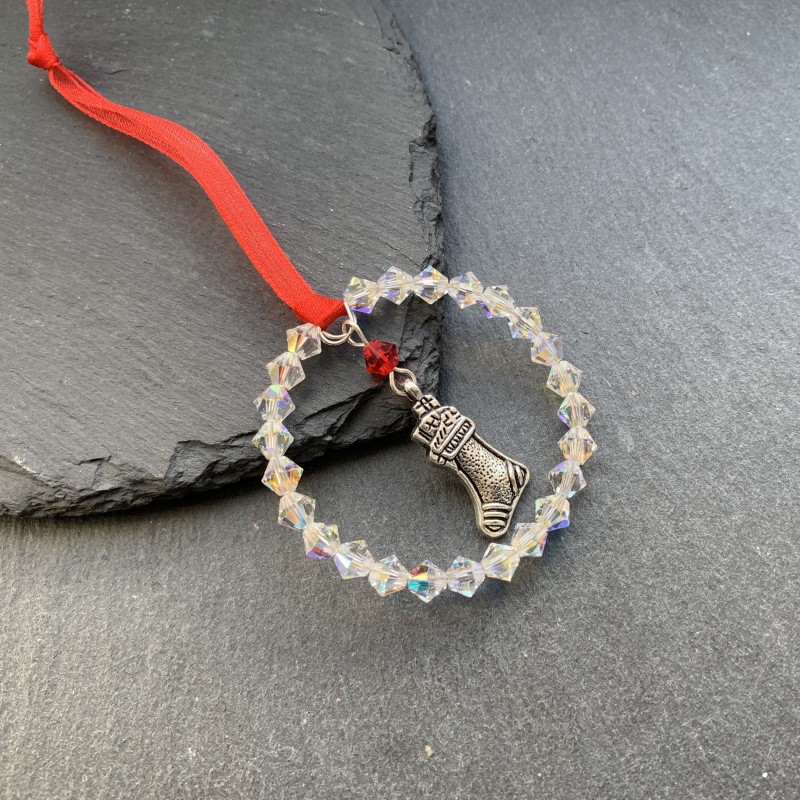 A stunning handmade Tibetan Stocking Charm Christmas Decoration using sparkly Preciosa Crystal with red organza ribbon. Size 4.5cms (excluding ribbon). Supplied in a white organza gift bag.