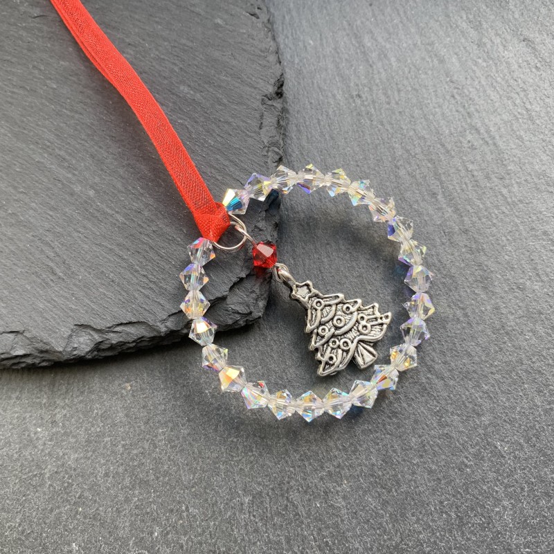 A stunning handmade Tibetan Tree2 Charm Christmas Decoration using sparkly Preciosa Crystal with red organza ribbon. Size 4.5cms (excluding ribbon). Supplied in a white organza gift bag.