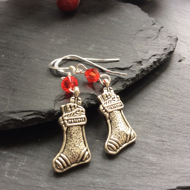 Sterling Silver earwires, Swarovski crystal or Preciosa Crystal with a Tibetan Stocking (1) charm pair of earrings. Supplied in a white organza gift bag.