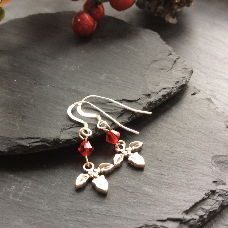 Sterling Silver earwires, Swarovski crystal or Preciosa Crystal with a Tibetan Holly charm pair of earrings. Supplied in a white organza gift bag.