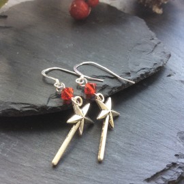 Sterling Silver earwires, Swarovski crystal or Preciosa Crystal with a Tibetan Fairy Wand charm pair of earrings. Supplied in a white organza gift bag.